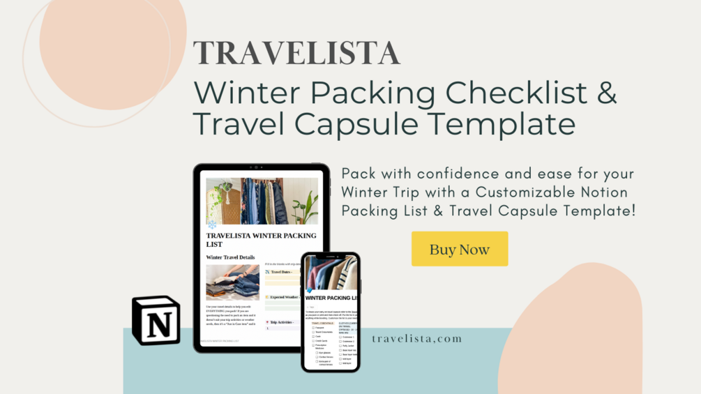Our Notion template is a comprehensive guide to packing light and stylishly for winter travel that includes a customizable packing list, a travel capsule template and outfit planner and winter packing tips.